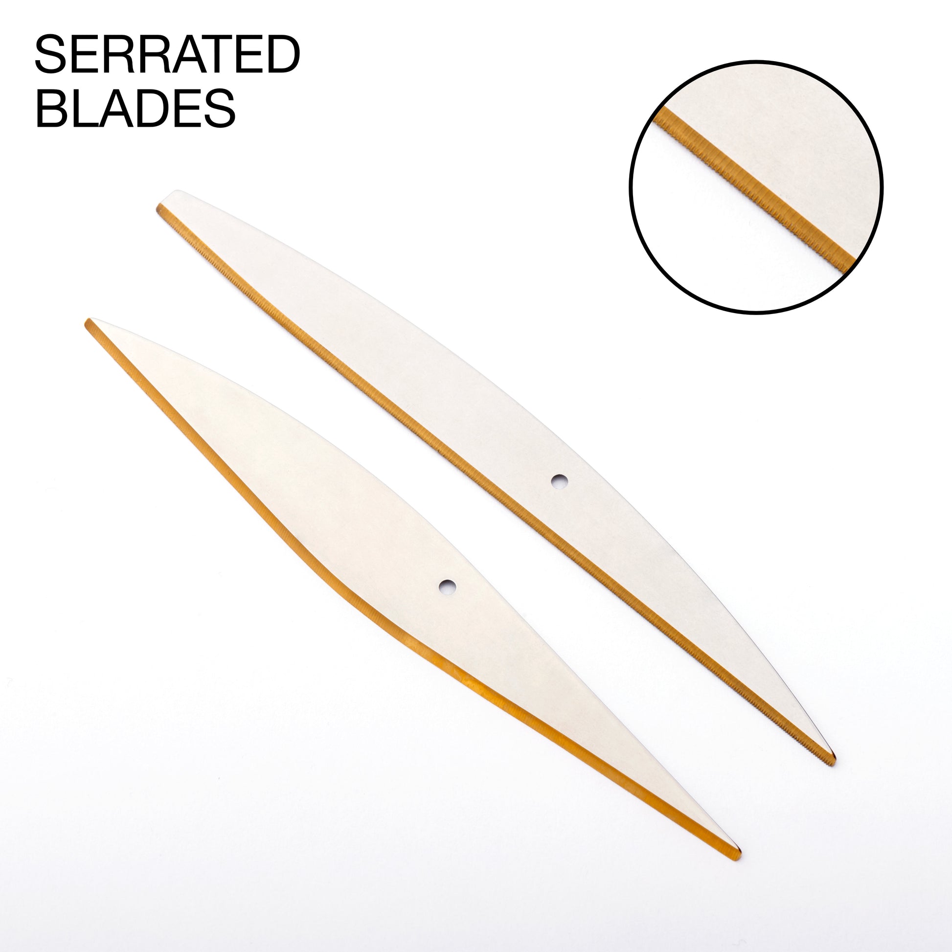 Serrated Blades for cutting light, slippery materials. The upper blade is serrated.